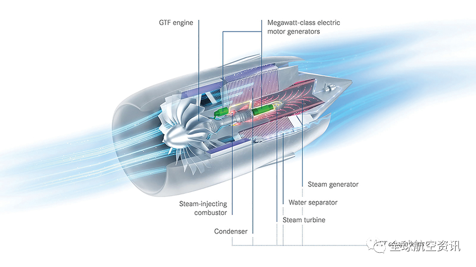 在亞音速領域,空客公司還與普惠公司和MTU航空發(fā)動機公司合作,參與歐洲“清潔航空”研究計劃下的另一個先進推進項目Switch。Switch的目標是在21世紀30年代中期投入使用,目標是減少25%的二氧化碳排放,減少80%的氮氧化物排放,并減少不明原因的尾跡排放。在WET概念下,從廢氣中收集水,并使用熱交換器將水蒸發(fā)成蒸汽。蒸汽被注入燃燒室,從而提高了燃料效率。